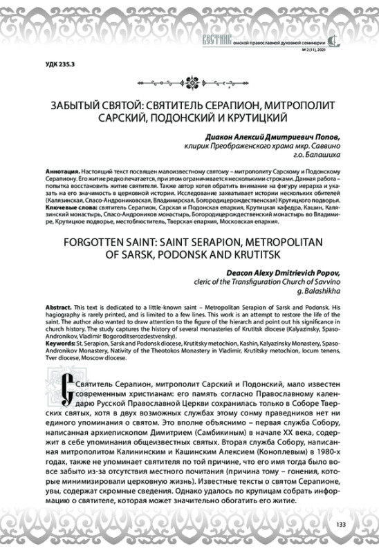 Попов А.Д., диак. Забытый святой: святитель Серапион, митрополит Сарский, Подонский и Крутицкий // Вестник Омской православной духовной семинарии. - 2021. - №2 (11). - С.133-140.