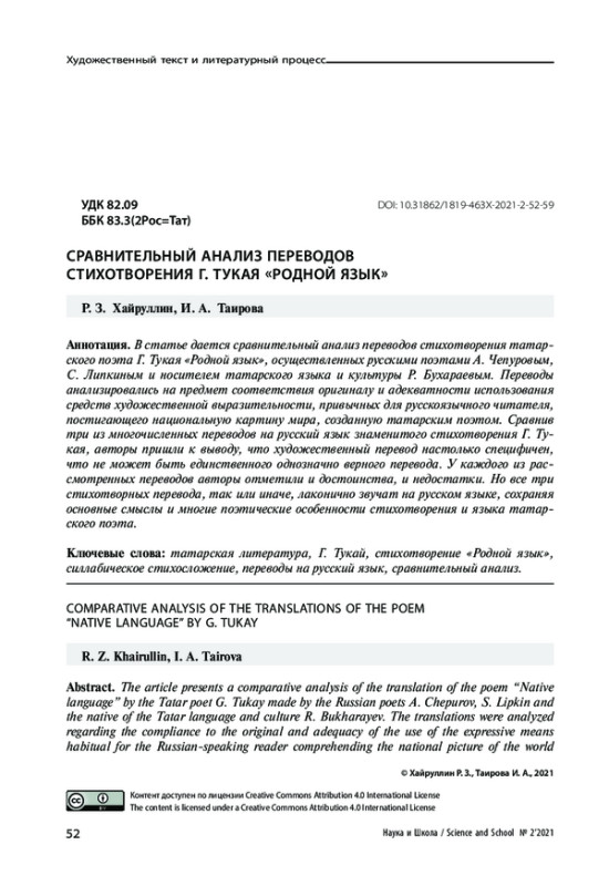 Статья: СРАВНИТЕЛЬНЫЙ АНАЛИЗ ПЕРЕВОДОВ СТИХОТВОРЕНИЯ Г. ТУКАЯ «РОДНОЙ ЯЗЫК»