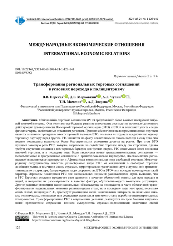 Статья: ТРАНСФОРМАЦИЯ РЕГИОНАЛЬНЫХ ТОРГОВЫХ СОГЛАШЕНИЙ В УСЛОВИЯХ ПЕРЕХОДА К ПОЛИЦЕНТРИЗМУ