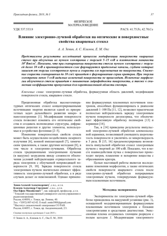 Статья: Влияние электронно-лучевой обработки на оптические и поверхностные свойства кварцевых стекол