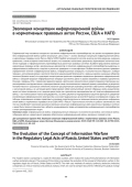 Современный мир постоянно находится в состоянии информационного противоборства, что делает исследование феномена информационной войны крайне актуальным. Цель статьи — анализ эволюции концепции информационной войны в нормативных правовых актах России, США и НАТО. В работе используются методы анализа, синтеза, дедукции, индукции, сравнения, а также историко-политический анализ, что позволяет сопоставить документы, отражающие поэтапное изменение подходов к информационному противоборству в различных правовых системах. В работе представлена эволюция нормативных правовых актов и доктринальных документов по тематике информационного противоборства, выявлены их содержательные особенности, сходства и различия, проведена их классификация. Особое внимание уделено правовым определениям понятий «информационная война», «информационные операции», «психологические операции», «кибероперации», «когнитивная война» в контексте стратегий национальной безопасности и военных доктрин указанных субъектов политики. Делается вывод, что существуют концептуальные различия в правовом закреплении феномена информационной войны: в западной традиции информационные операции достаточно давно и широко отражены в правовых документах. Начиная с середины XX в. с появлением ядерного оружия и ростом роли некинетических средств поражения противника они рассматривались инструментально и преимущественно в виде психологических операций, однако в дальнейшем, в результате технологических и социальных изменений, получили расширительную трактовку, включив в себя аспекты киберопераций и когнитивной войны, и в настоящее время представляют собой неотъемлемый элемент гибридных войн, осуществляющихся не только в военное, но и в мирное время, тогда как в российском законодательстве нет понятия информационной войны,— его можно вывести только опосредованно, а в самих документах подчеркивается защитная функция и суверенная составляющая информационного пространства на основе традиционных ценностей. В рамках исследования созданы три таблицы, позволяющие наглядно представить ключевые сходства, различия и эволюцию развития концепции информационной войны в нормативных правовых актах США, НАТО и России. Теоретическая значимость работы заключается в том, что она способствует пониманию динамики эволюции концепции информационных войн в различных правовых системах и может быть полезна специалистам в области международного права, исследователям информационного противоборства и иным заинтересованным лицам.