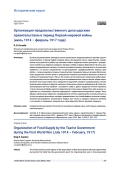 В статье рассматриваются некоторые аспекты организации продовольственных органов царским правительством в период Первой мировой войны. Описываются поиски правительства, направленные на улучшение их работы при заготовке хлеба и продуктов питания для армии и гражданского населения, на введение разверстки зерновых хлебов и фуража. Выясняются причины, срывавшие государственные поставки. Системно описываются реакция органов власти на возникшие проблемы и ее усилия, направленные на урегулирование продовольственного вопроса. Цель работы - проанализировать создание правительством продовольственных органов, обеспечивающих продуктами питания армию и гражданское население, рассмотреть эволюцию системы по снабжению продовольствием в России. На основе изучения архивных материалов, опубликованных документов, анализа обширного научно-исследовательского корпуса текстов, обзора периодической печати рассмотрен поиск преодоления трудностей, которыми сопровождались попытки правительства наладить снабжение населения страны всем жизненно необходимым. В статье проанализированы причины проблем с поставками хлеба и других продуктов питания населению, а также механизмы борьбы царского правительства с возникшими трудностями. Для анализа материалов мы использовали системно-структурный и сравнительно-исторический методы. Таким образом, объективные недостатки государственной системы правительство пыталось восполнить за счет улучшения организации поставок продовольствия, что способствовало усилению государственного регулирования, установлению твердых цен только на продукты сельского хозяйства и что привело к сокращению товарной доли, производимой в России зерновой продукции.